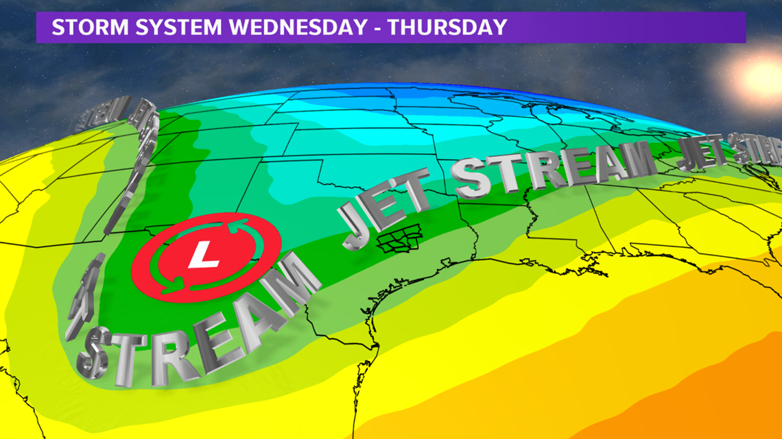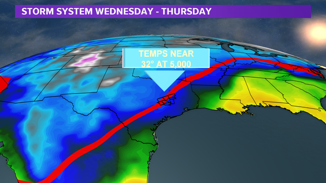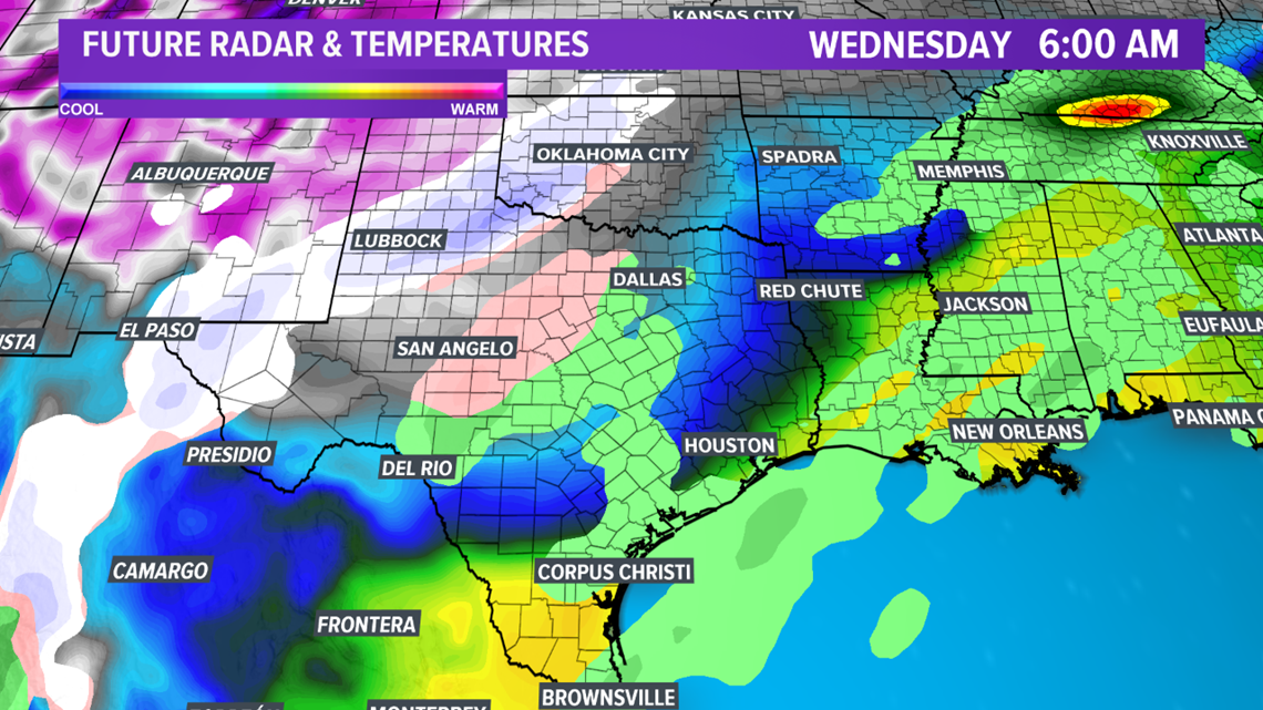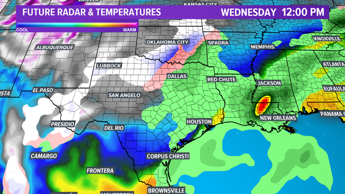 BRYAN, Texas — Monitoring a high-impact storm system & Arctic cold front that will impact the Brazos Valley by mid-week. A potent upper-level low is currently off of the West Coast and will advance east through early week. The approach of the storm system will help Gulf moisture work its way into Texas, including the Brazos Valley. A few storms will develop as early as late-Monday across eastern Texas as moisture increases and weak upper-level energy moves in from the southwest. These storms may produce some small hail but severe weather is not expected due to limited instability & non-favorable shear profiles.