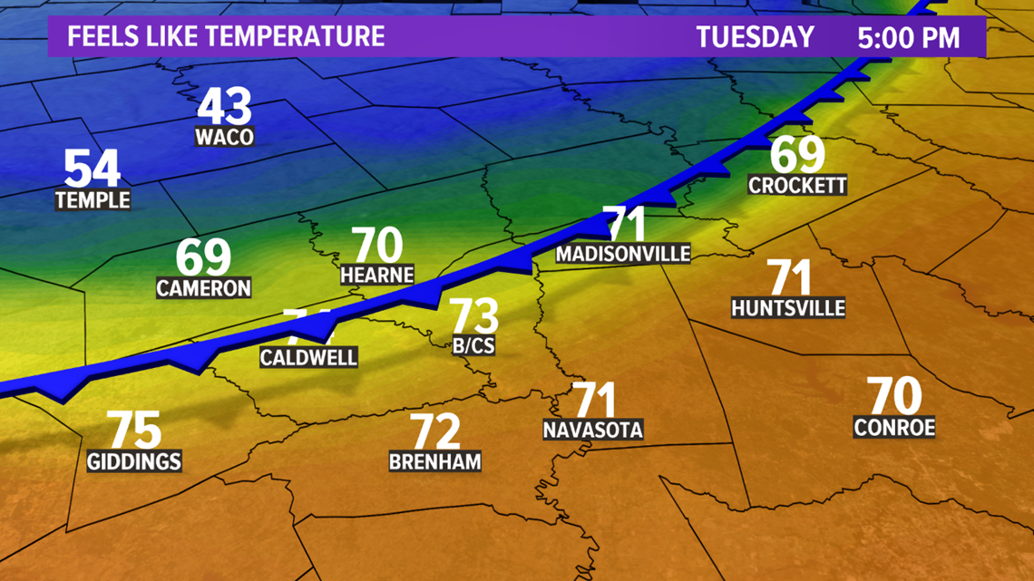 The storm system will continue to approach on Tuesday and begin to amplify. This will help an Arctic airmass dive south across the Plains. This Arctic cold front will move into the Brazos Valley late in the day on Tuesday. Wind chills will quickly fall into the 20s & 30s. This boundary will help trigger a few thunderstorms but the front will move so quickly, it will act to undercut the updrafts. This will limit severe potential for the Brazos Valley. However, farther east, instability will be better & shear profiles will be more favorable for isolated severe thunderstorms across eastern Texas. The main hazards appear to be damaging winds & large hail but an isolated tornado cannot be ruled out.