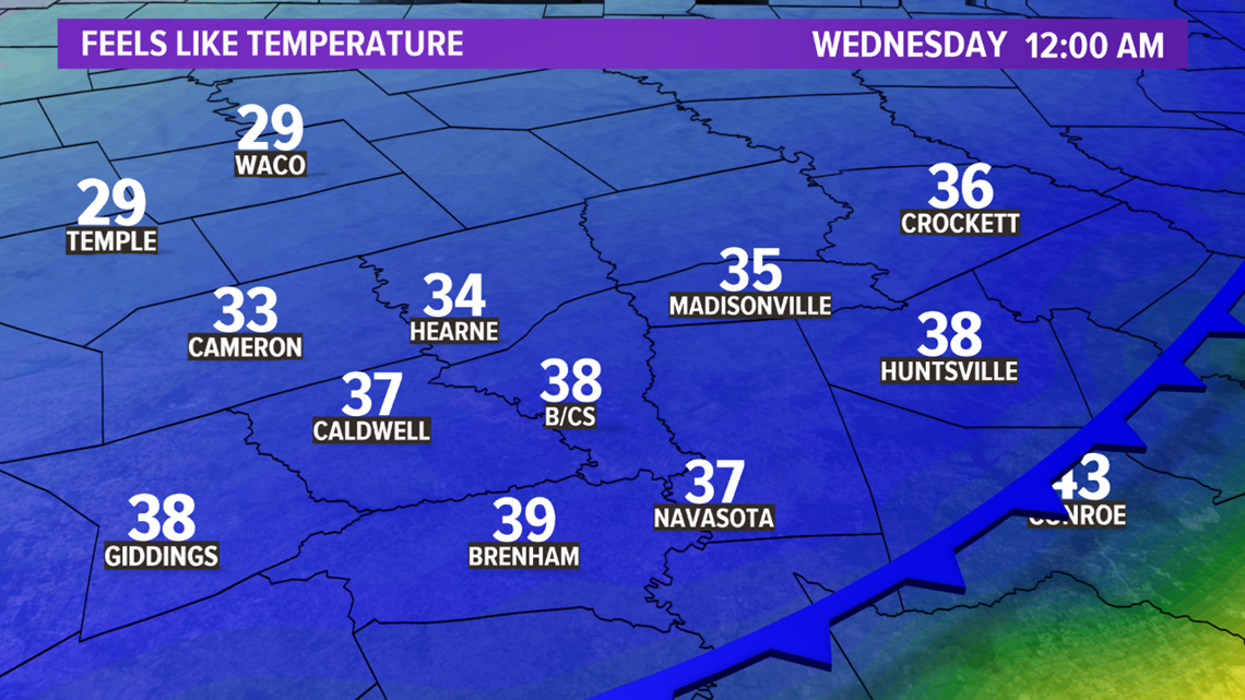 Farther south in the Brazos Valley, the freezing line will begin shifting south late-Wednesday into early Thursday. At this time, the main trough will work its way into the region, generating another area of lift. This will allow wintry precipitation to fall across the northern half of the Brazos Valley overnight Wednesday into early Thursday. It appears sleet & snow are possible if enough moisture can stick around with the colder air moving in. It is too early to forecast exact details and there are a lot of questions that need to be answered but a wintry threat does exist overnight Wednesday. The best window for wintry precipitation in the Brazos Valley is from 10:00 pm Wednesday through 6:00 am Thursday.